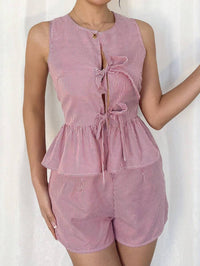 Womens Fashion Striped Short-Sleeve Bow-Knot Shorts Set Womens Fashion Striped Short-Sleeve Bow-Knot Shorts Set