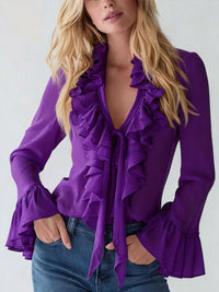 French-Elegant Solid-Color V-Neck Ruffle Blouse With Puff Sleeves French-Elegant Solid-Color V-Neck Ruffle Blouse With Puff Sleeves
